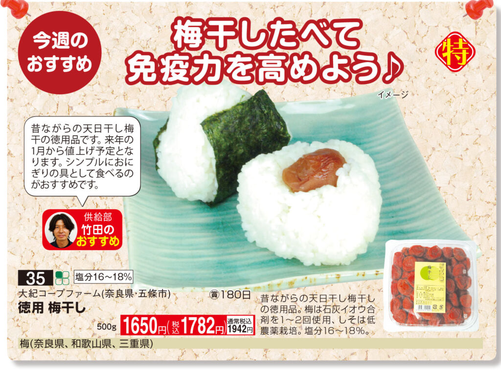 12月1回カタログでご紹介するのは、昔ながらの天日干し梅干しの徳用品です。梅は石灰イオウ合剤を1~2回使用。農薬節減栽培のしそ、沖縄の塩「青い海」を使って漬けました。