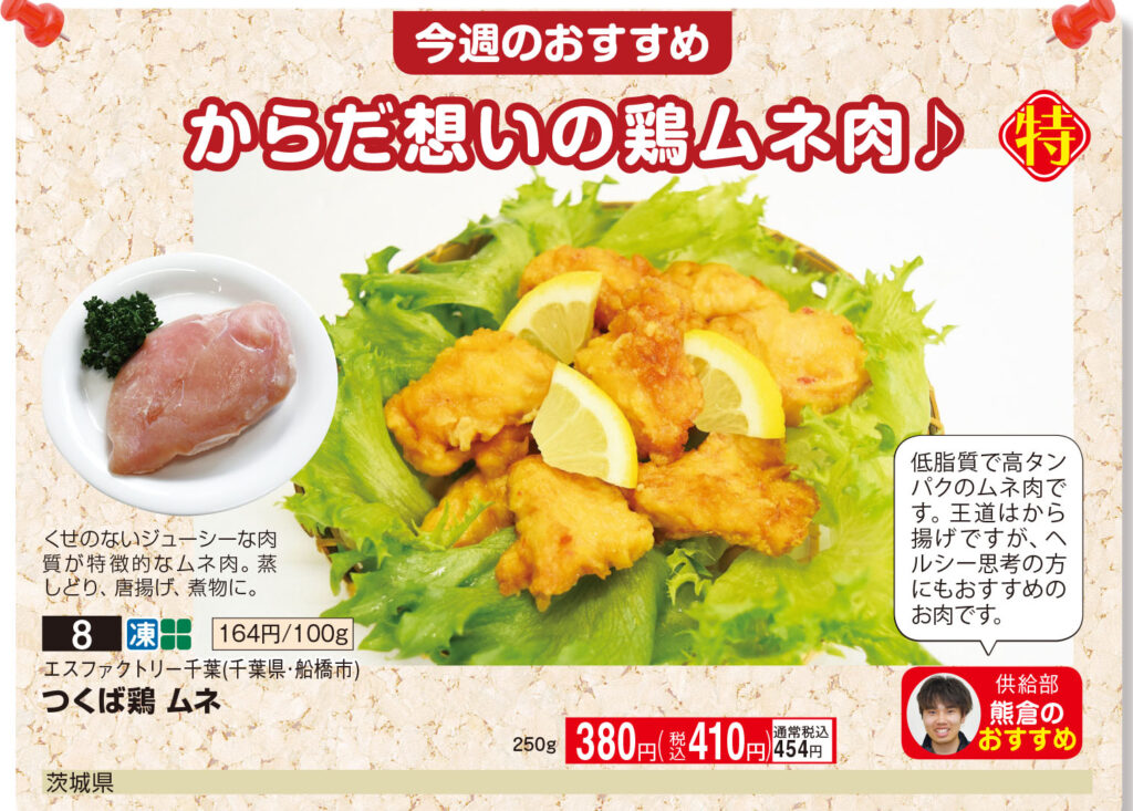 おすすめは唐揚げです。「から揚げといえばモモ」というイメージがあるかもしれませんが、ムネ肉のから揚げはさっぱりとしていて噛み応えがあり、モモとはまた違ったおいしさ。お弁当にもピッタリです。