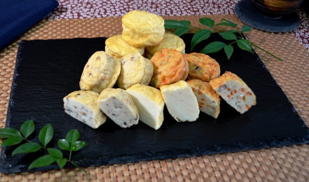 - おとうふ揚げ(五目)×3個:5種の野菜(人参・筍・ごぼう・椎茸・枝豆)を練りこみました。カット面が彩り鮮やかです。