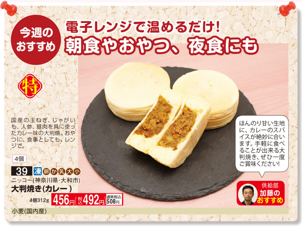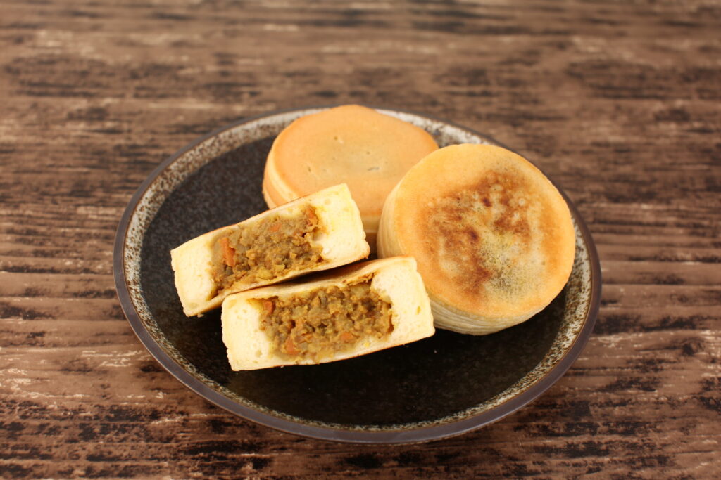 3月2回でご紹介するのは、その中でもちょっと珍しいカレー味の大判焼。オリジナル生地の中に、国産の玉ねぎ、じゃがいも、人参、豚肉で作った具がたっぷり入っています。