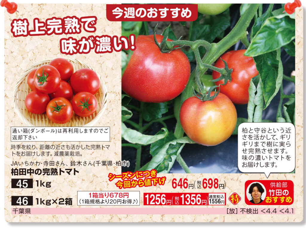 「柏田中の完熟トマト」は、樹上完熟させたトマトです。収穫してすぐに近隣の組合員の元へ届くため、トマトの濃厚な旨味が楽しめます。