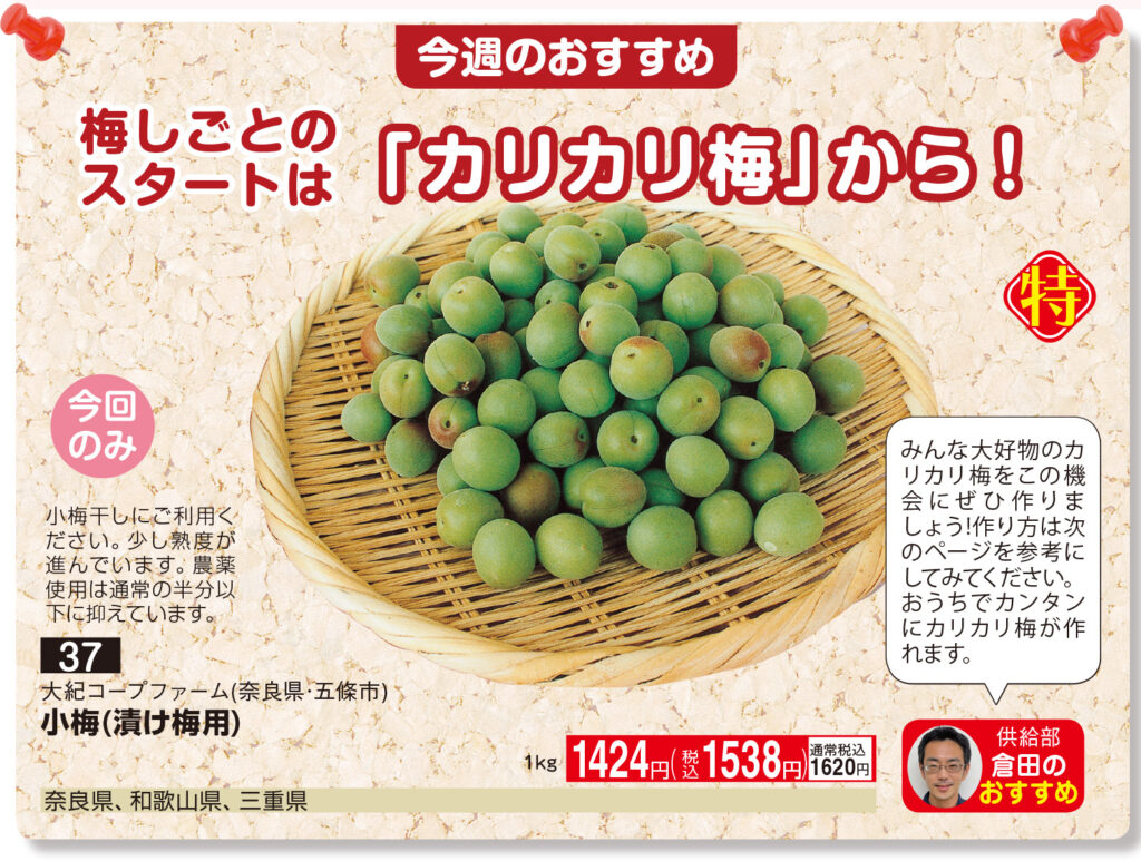 - 5月下旬~6月上旬:緑色の大粒で硬さがある「青梅」 の状態。梅酒、梅シロップ(梅ジュース)、しょうゆ漬け、甘露煮、梅味噌など。